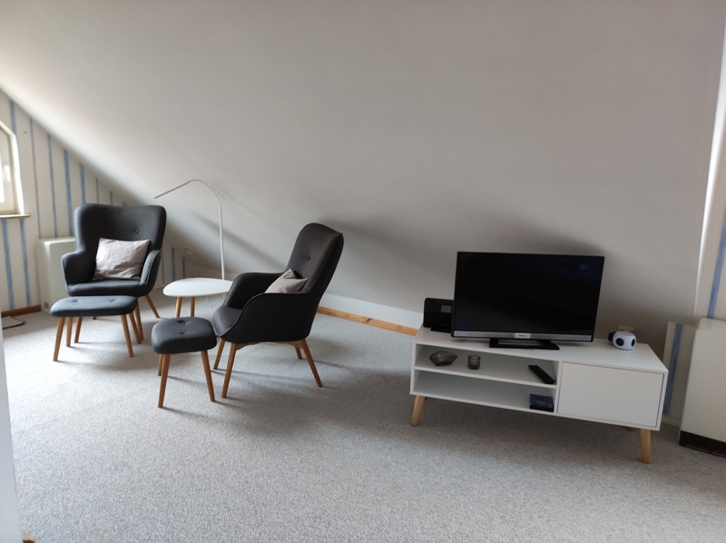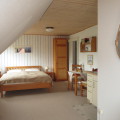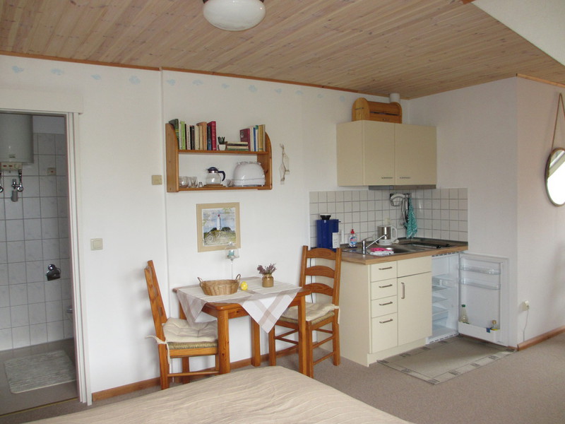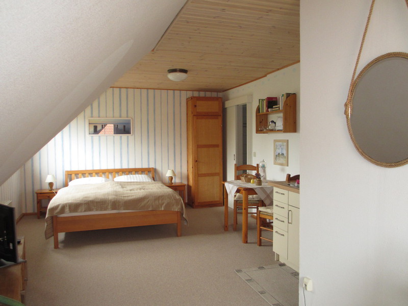 Diese Ferienwohnung befindet sich in der oberen Etage auf der Nordseite des Hauses und hat eine Größe von ca. 25 m² inkl. Dachschrägen. Am Tage können Sie von dort den Leuchtturm sehen und Nachts